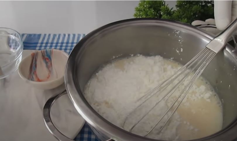 Στη συνέχεια προσθέτουμε το γάλα, τη ζάχαρη, το κορν φλάουερ και ανακατεύουμε καλά να διαλυθεί.