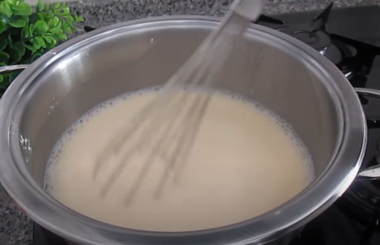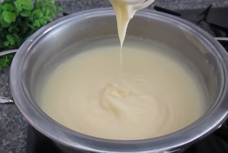 Βάζουμε τη κατσαρόλα σε μέτρια φωτιά και ανακατεύουμε συνεχώς μέχρι να πήξει.