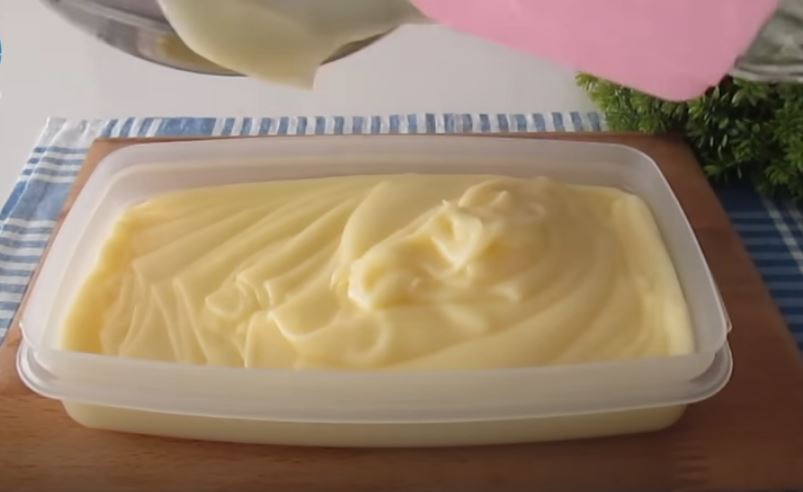 Βουτυρώνουμε ένα μακρόστενο τάπερ και ρίχνουμε την κρέμα.