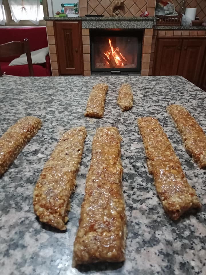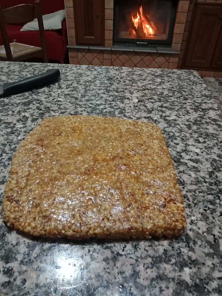 την κανέλα και προσθέτουμε τα ψιλοκομμένα αποξηραμένα φρούτα, μαγειρεύουμε για λίγα λεπτά, το δουλεύουμε στο παγκο μας, πλάθοντάς το.