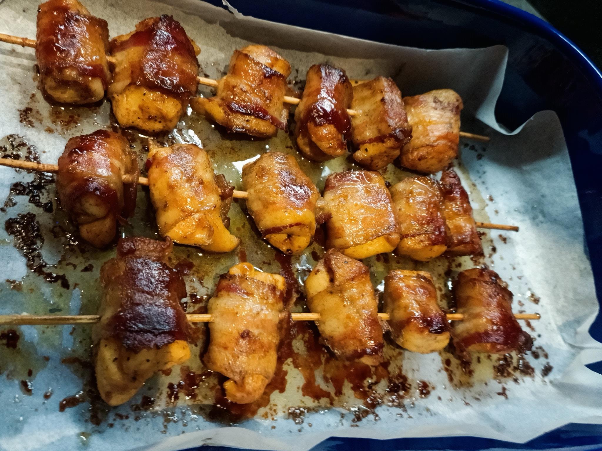 Απόψε για δείπνο μπέικον τυλιγμένο σε μπουκιές κοτόπουλου μαγειρεμένες στο τηγάνι και μετά στο φούρνο 😋.