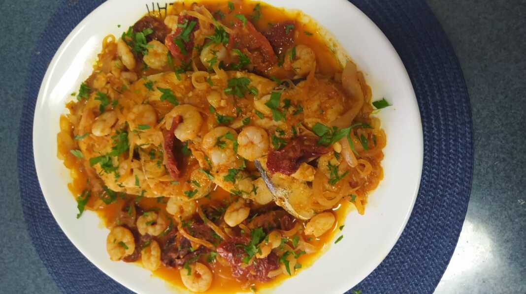 Αλατοπιπερώνουμε τον μπακαλιάρο και τον προσθέτουμε στη σάλτσα, τέσσερα λεπτά ανά πλευρά, προσθέτουμε τις ενυδατωμένες ντομάτες. Τα τελευταία δύο λεπτά προσθέτουμε τις γαρίδες, πάντα σε τηγάνι με το καπάκι και σε χαμηλή φωτιά.