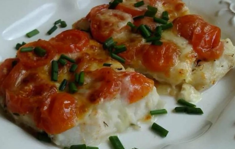 Μπακαλιάρος ψημένος με ντομάτα και τυρί