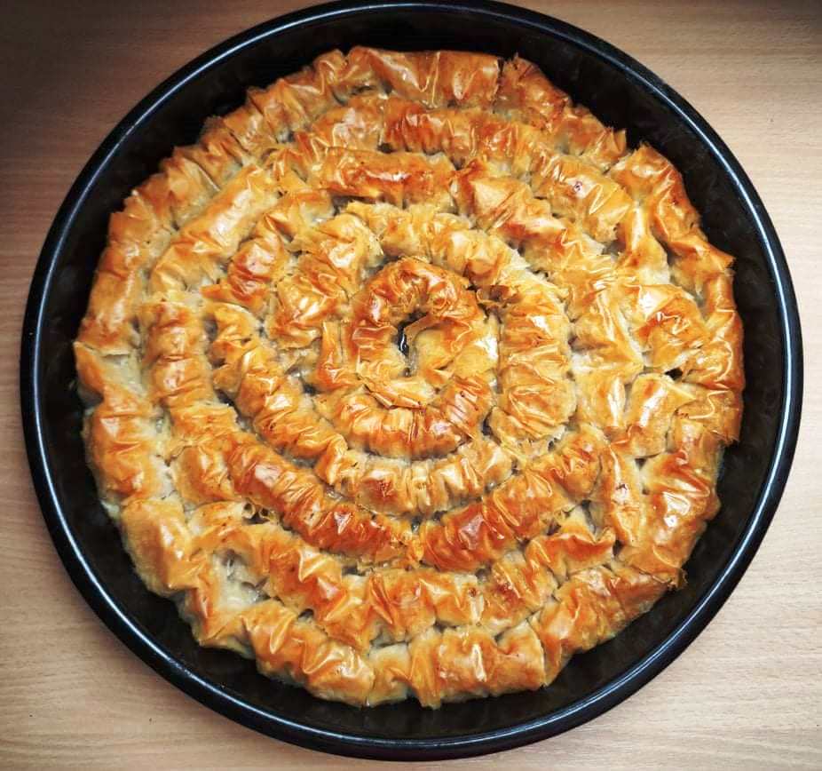 Τοποθετούμε την κρούστα σε κατάλληλο στρογγυλό ταψί απο το κέντρο προς τα εξω και συνεχίζουμε με τον ίδιο τρόπο μέχρι να γίνουν