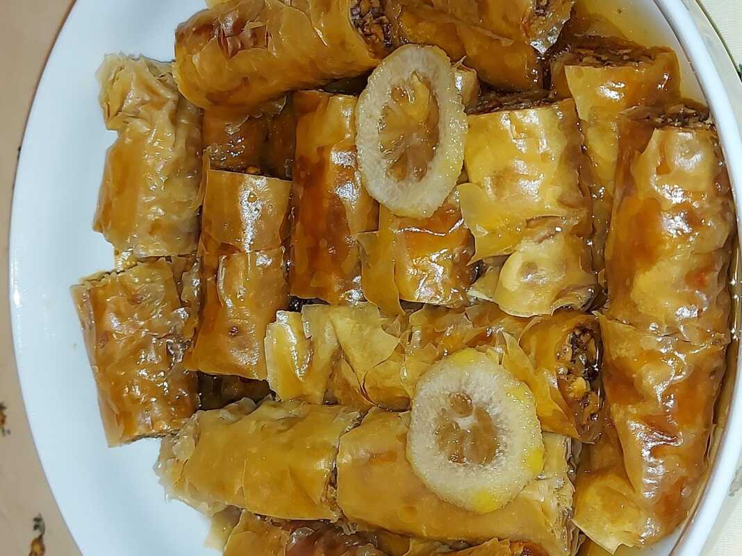 Συνεχίστε την ίδια διαδικασία, φύλλο, ράντισμα, φύλλο, ράντισμα, καρύδι, φύλλο ράντισμα, φύλλο ράντισμα, τύλιγμα, κόψιμο ώσπου να τελειώσουν τα φύλλα.