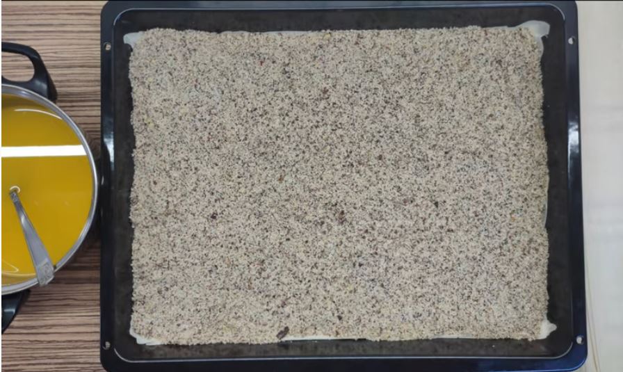 Στη συνέχεια από πάνω στρώνουμε άλλα 2 φύλλα, τα ραντίζουμε πάλι με το μείγμα βουτύρου και ρίχνουμε το υπόλοιπο καρύδι.