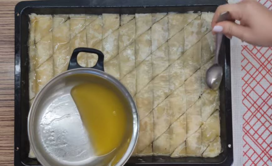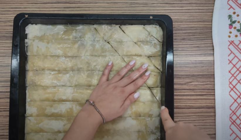 Ξανά στρώνουμε άλλο ένα φύλλο, ραντίζουμε με βούτυρο, βάζουμε από πάνω ακόμα ένα φύλλο και ξεκινάμε και κόβουμε τα κομμάτια με τον παραδοσιακό τρόπο. Έχουμε φτιάξει τον παραδοσιακό μας Μπακλαβά.
