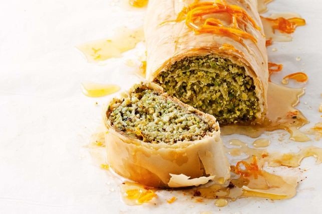 Τοποθετήστε 1 φύλλο κρούστας σε καθαρή επιφάνεια εργασίας. Αλλέιψτε το με λίγο λειωμένο βούτυρο. Από πάνω βάλτε άλλο ένα φύλλο. Επαναλάβετε το ιδιο και με τα υπόλοιπα φύλλα και το βούτυρο για να σχηματιστεί μια στοίβα. Με τη μικρότερη πλευρά προς το μέρος σας, απλώστε το μείγμα των καρπών ομοιόμορφα πάνω στο φύλλο, αφήνοντας ένα 1 εκατοστό από τις άκρες. Προσεκτικά διπλώστε από τη πιο κοντινή πλευρά σε σας για να κλείσετε τη γέμιση.