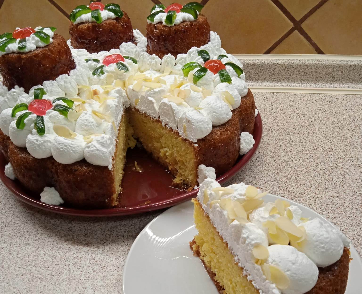 Όταν πιει το γλυκό μας το σιρόπι τοποθετούμε τον μπαμπά του ταψιού σε μια πιατέλα, χτυπάμε την κρέμα γάλακτος με την άχνη μέχρι να γίνει μια σφιχτή σαντυγί, καλύπτουμε με αυτήν το γλυκό μας.