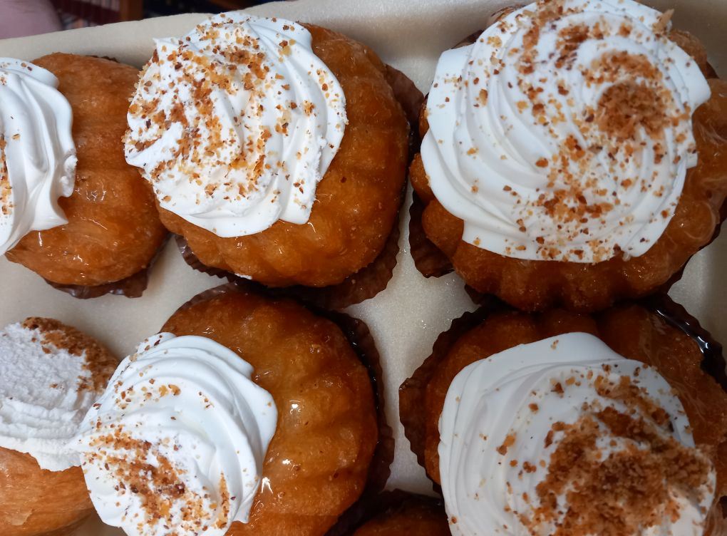 8. Χτυπάω τη μόρφατ με τη ζάχαρη άχνη μέχρι να γίνει μια αφράτη κρέμα. κόβω τα μπαμπαδάκια στη μέση, τα γεμίζω με την κρέμα και βάζω μέσα και γλυκό κεράσι που έχω στραγγίσει καλά από το σιρόπι του.