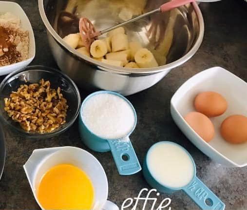 Λιώνω τις μπανανες χτυπω λιγο τα αυγα, τα προσθετω στις μπανανες και το γαλα, ζαχαρη, βουτυρο λιωμένο, ανακατεύω με κουτάλα, προσθετω το αλευρι με το αλάτι, σόδα, κανέλα, γαρύΦαλο.