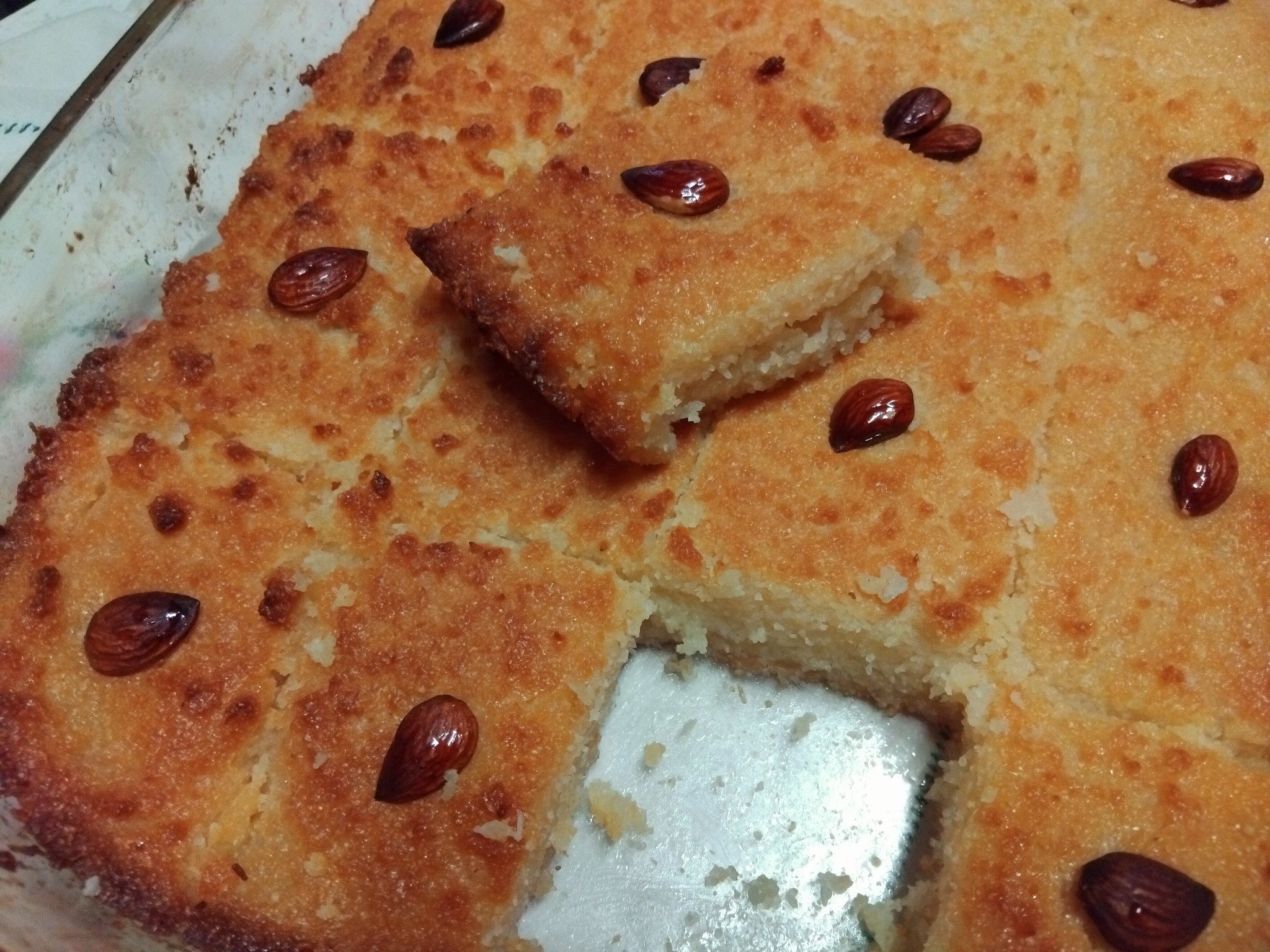 - Τοποθετούμε το μείγμα σε ένα καλά βουτυρωμένο ταψί διαμέτρου εικοσιτριών εκατοστών. Το απλώνουμε καλά και ομοιόμορφα και το χαράζουμε πριν το ψήσουμε, κόβοντάς το σε τετράγωνα ή όπως κόβουμε τον μπακλαβά. Τοποθετούμε στο κέντρο κάθε κομματιού από ένα αμύγδαλο.