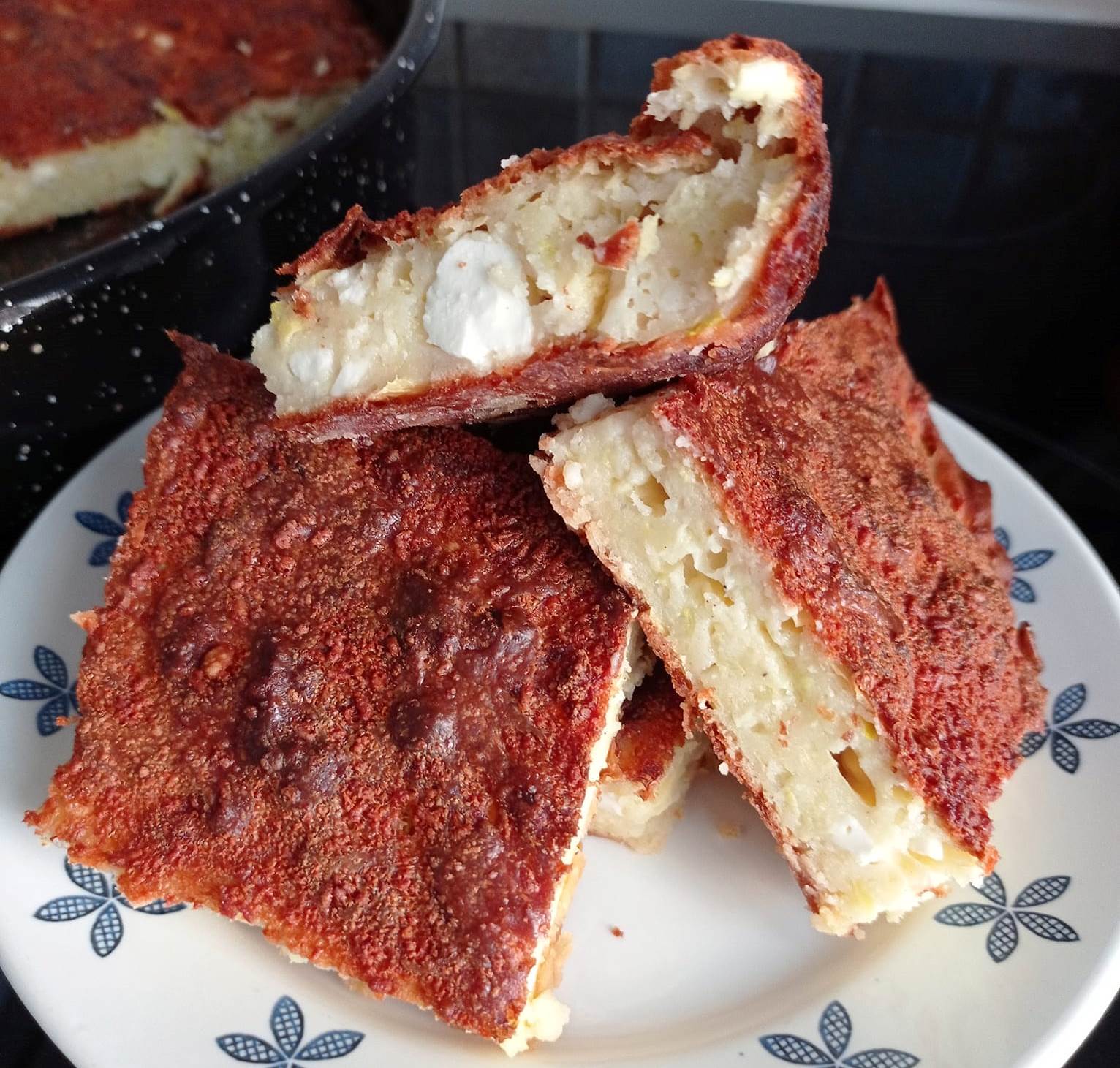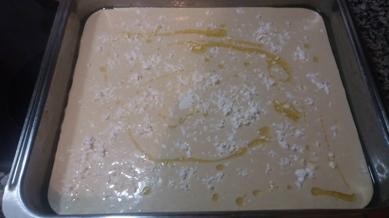 Θρυμματίζουμε τη φέτα μ ένα πιρούνι.Ρίχνουμε σ ένα μεγάλο μπολ όλα τα υλικά και τα ανακατεύουμε όλα μαζί.Μετά ρίχνουμε το αλεύρι για όλες τις χρήσεις λίγο λίγο κοσκινισμένο μέχρι να γίνει ένα μείγμα ούτε πολύ νερουλό ούτε πολύ παχύρευστο.Ρίχνουμε το μείγμα σε αντικολλητικό ταψί αφού το έχουμε λαδώσει.Από πάνω ρίχνουμε λίγη φέτα τριμμένη και λίγο λάδι.