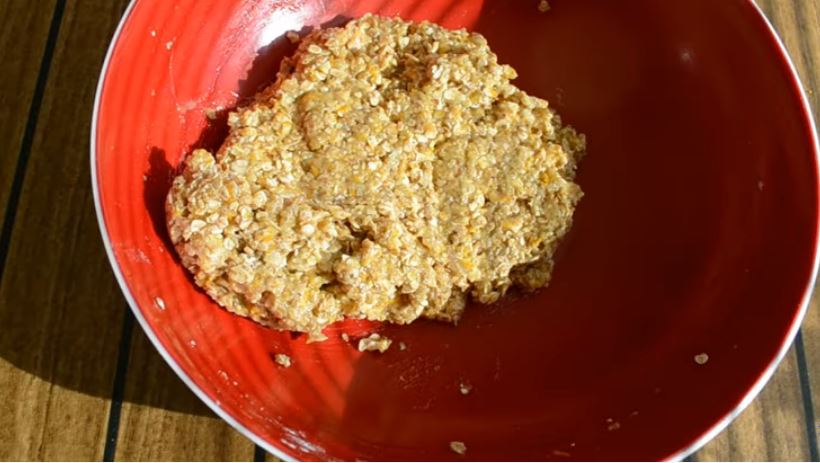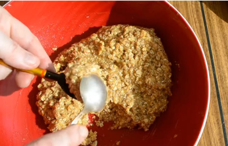 Σε μία μπασίνα ρίχνουμε το ξύσμα από ένα πορτοκάλι, προσθέτουμε τα αυγά και χτυπάμε με ένα σύρμα χειρός. Ρίχνουμε το λάδι, την βρώμη, ζάχαρη, βανιλίνη, και ανακατεύουμε με το συρμα. Μετα προσθέτουμε το αλάτι, κορν φλαουρ, μπεικιν παουντερ και ανκατευουμε λίγο και ρίχνουμε και τα τριμμένα καρύδια και κάνουνε μια πολύ καλή ανάμειξη για να γίνει μια σφιχτή πάστα.