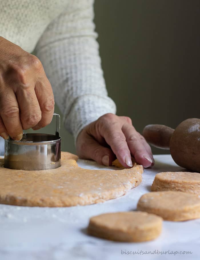 Ανοίξτε τη ζύμη σε πάχος 1,5 εκ. και κόψτε με ένα κόφτη σε 4,5 – 5 εκ κυκλους.