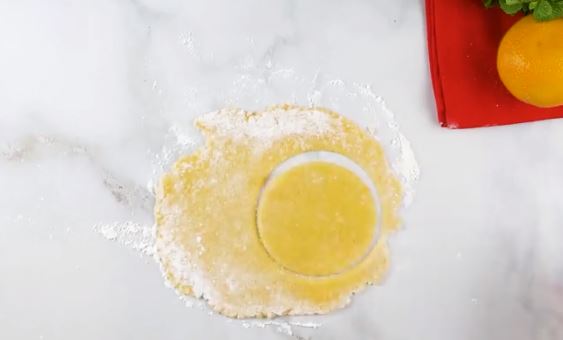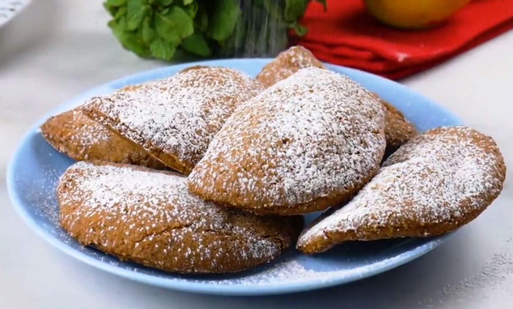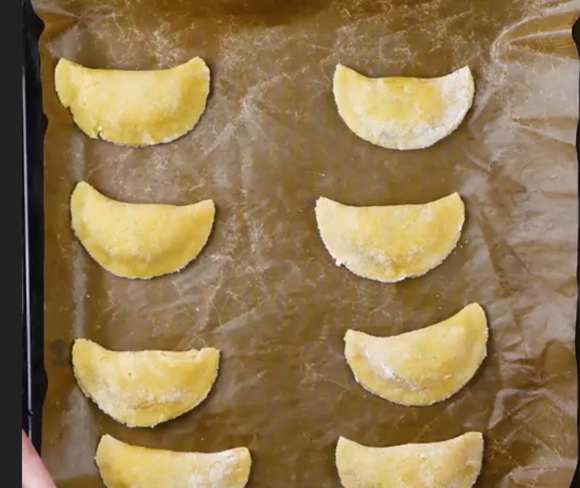 Στο κέντρο κάθε κομματιού, τοποθετήστε 1 κουταλάκι του γλυκού γέμιση και κλείστε την ζύμη σε σχήμα μισού φεγγαριού,πιέστε προς τα κάτω κολλήσει, βεβαιωθείτε ότι είναι σωστά σφραγισμένα για να αποφύγετε τη διαρροή. Τοποθετήστε τα σε λαδωμένο ταψί. Όταν τα ετοιμάσετε όλα , συνεχίστε με το ψήσιμο.