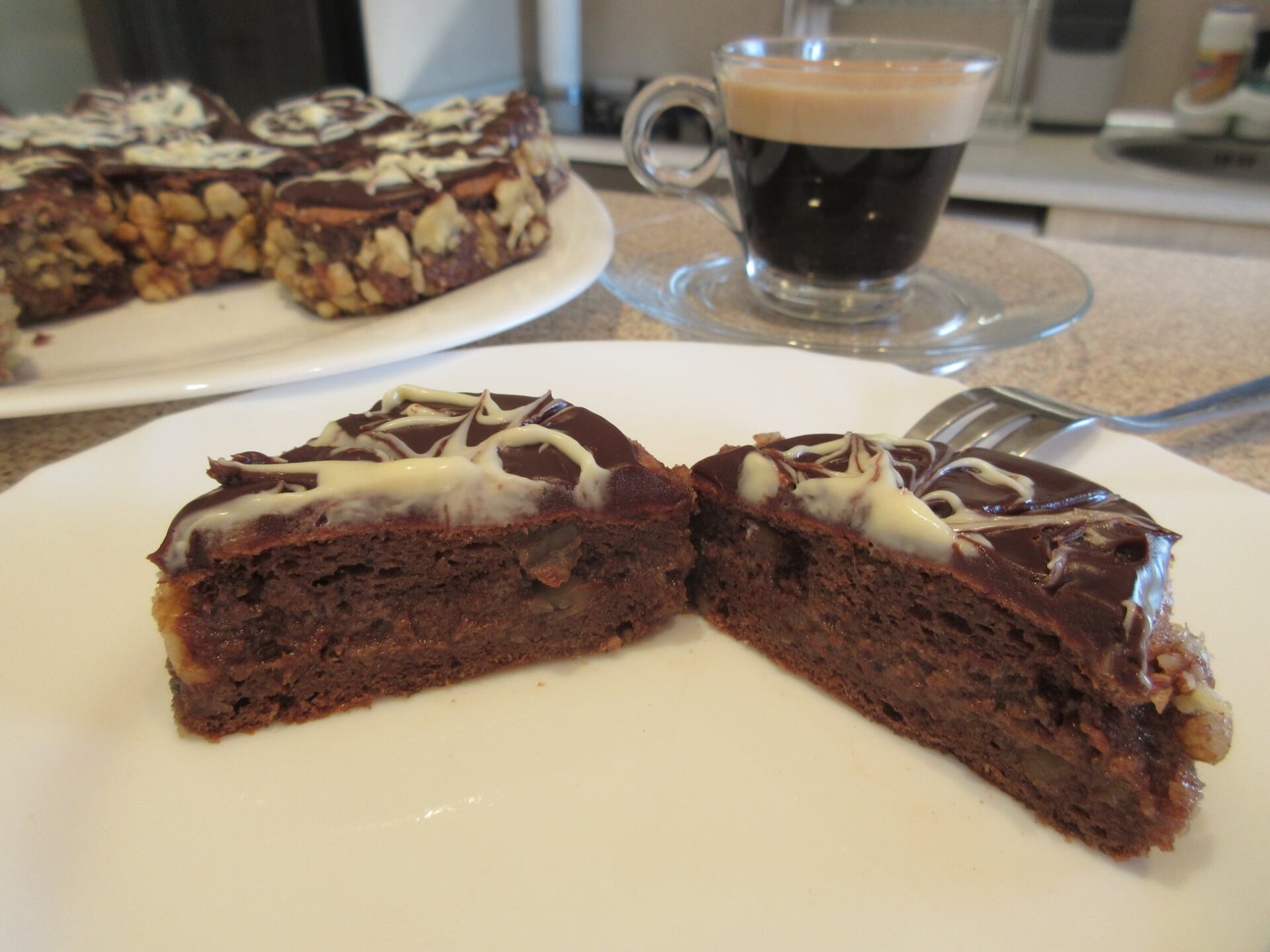 Χτυπάμε το βούτυρο με τη ζάχαρη, προσθέτουμε έναν έναν τους κρόκους, συνεχίζοντας το χτύπημα με το μίξερ, προσθέτουμε τη βανίλια. Προσθέτουμε το κακάο, το αλεύρι και τους ξηρούς καρπούς. Τέλος προσθέτουμε τα χτυπημένα ασπράδια. Αδειάζουμε το μείγμα που προκύπτει σε ένα μεγάλο ορθογώνιο ταψί, προστρωμένο με χαρτί ψησίματος.