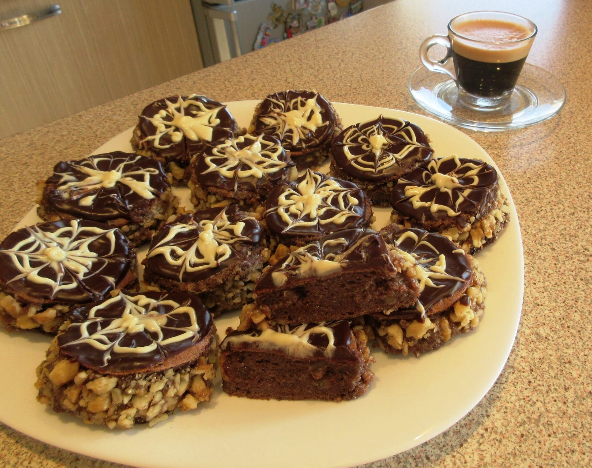 Χτυπάμε το βούτυρο με τη ζάχαρη, προσθέτουμε έναν έναν τους κρόκους, συνεχίζοντας το χτύπημα με το μίξερ, προσθέτουμε τη βανίλια. Προσθέτουμε το κακάο, το αλεύρι και τους ξηρούς καρπούς. Τέλος προσθέτουμε τα χτυπημένα ασπράδια. Αδειάζουμε το μείγμα που προκύπτει σε ένα μεγάλο ορθογώνιο ταψί, προστρωμένο με χαρτί ψησίματος.
