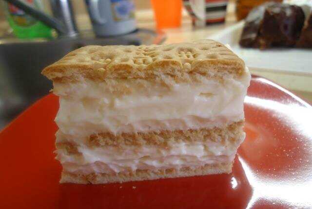 Βουτήξτε τα μπισκότα σε χλιαρό γάλα και τοποθετήστε τα σε ένα ταψί σε τρεις στρωσεις με κρεμα ενδιάμεσα.