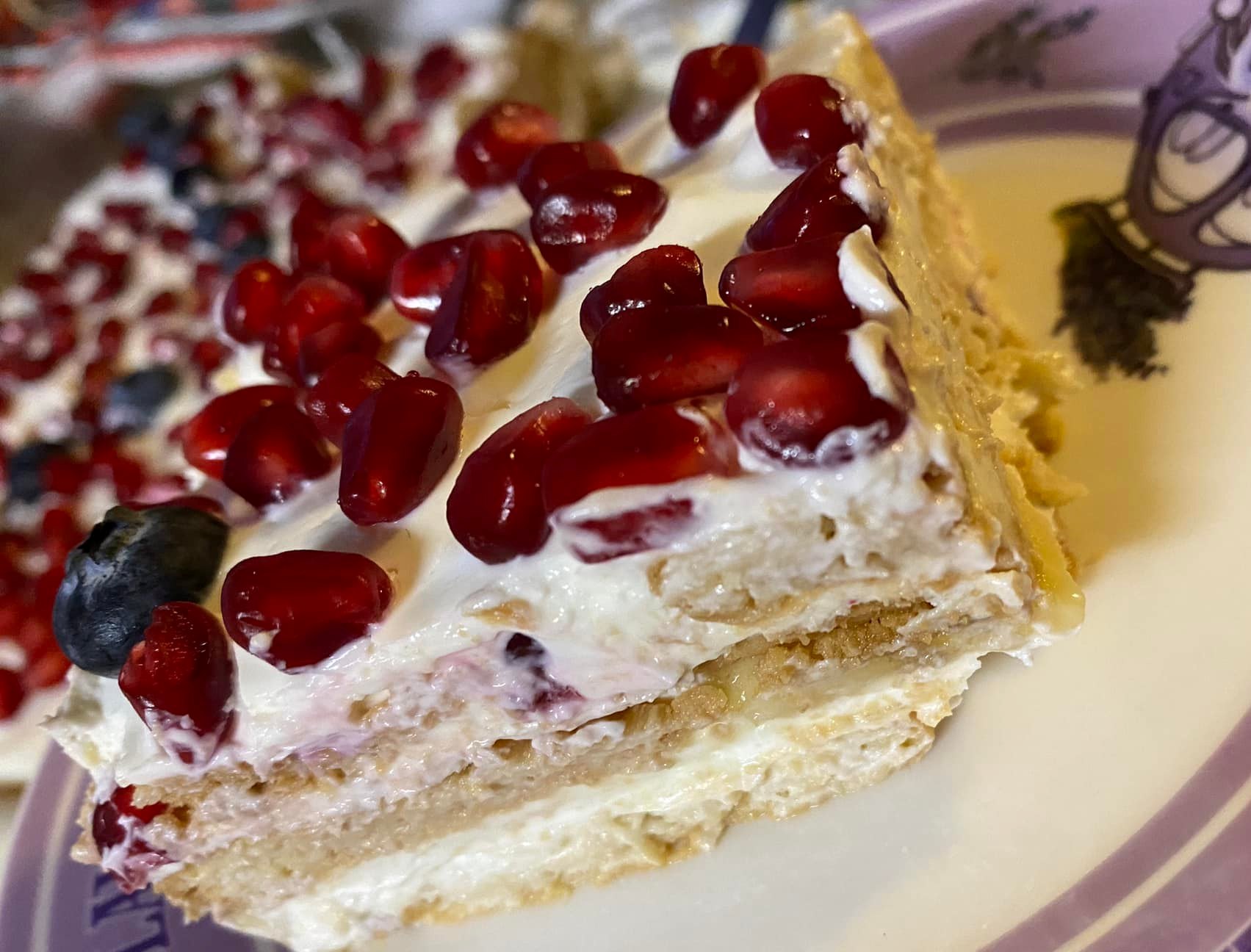 και συνεχίζω μέχρι να εξαντήσω τα υλικά. Τελειώστε με κρέμα και διακοσμήστε με φρούτα ή σοκολάτα.