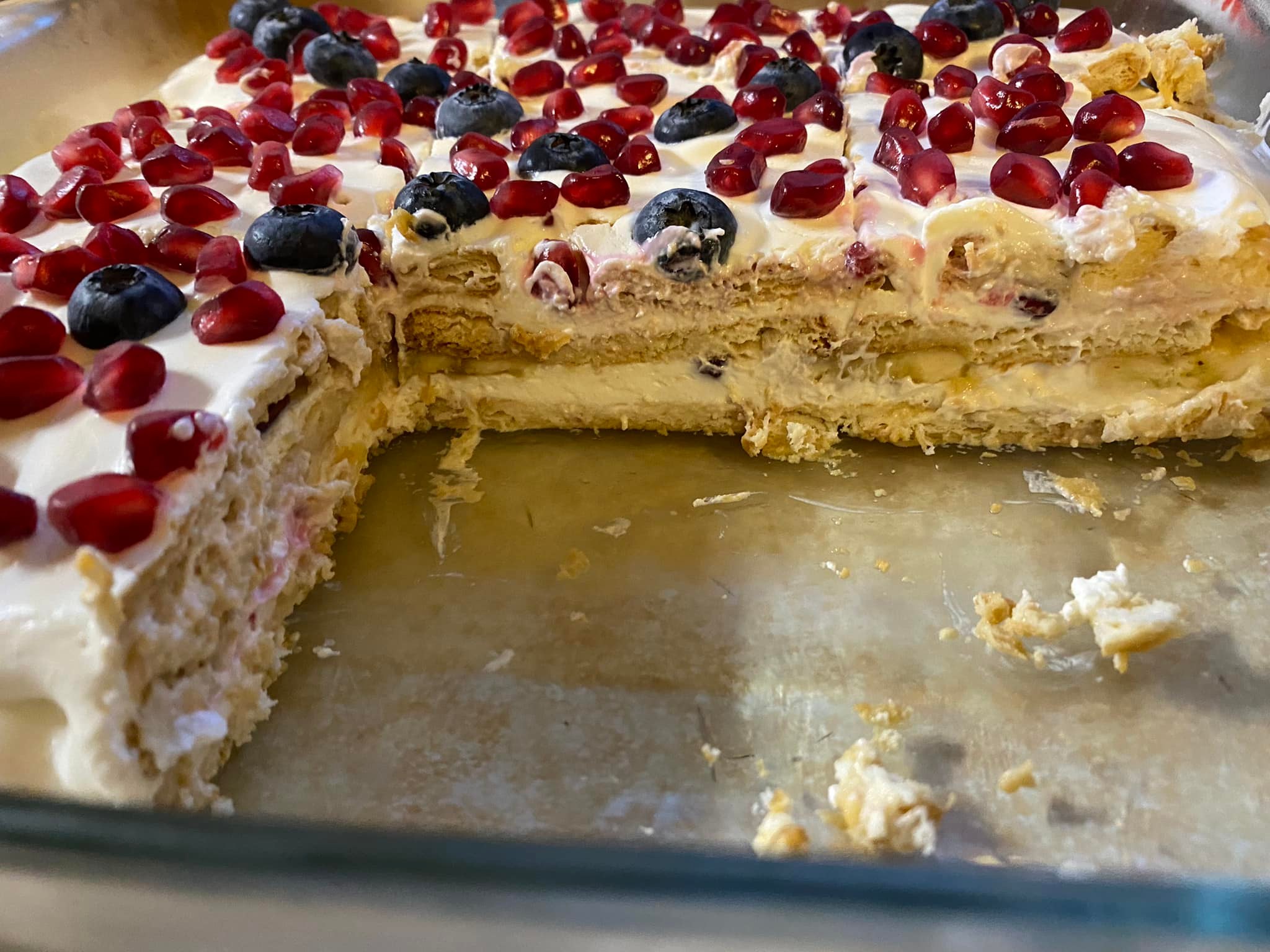 Κόβω την μπανάνα σε φέτες για να τις στρωσω ανάμεσα στις σειρές μπισκότων μαζί με τους σπόρους ροδιού και κραταω και λίγο για διακόσμηση) επίσης θα βάλω και λίγα βατόμουρα για χρώμα στο κέικ.