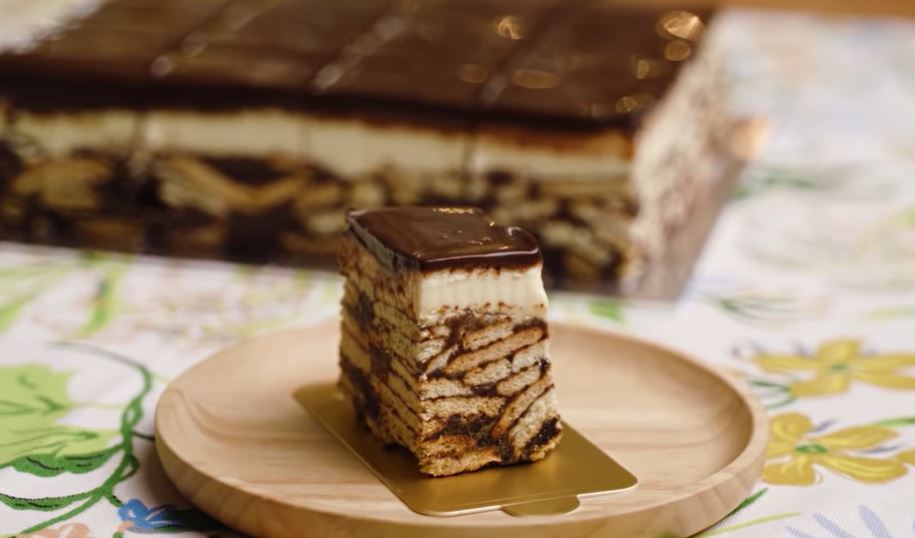 Βγάζουμε το γλυκό μας από το ψυγείο και απλώνουμε από πάνω τη σοκολάτα ισιώνουμε και την ξαναβάζουμε στο ψυγείο για όλη τη νύχτα Όταν τη βγάλουμε το πρωί βγάζουμε τη φόρμα αφαιρούμε το χαρτί κόβουμε και σερβίρουμε