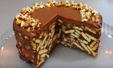 Σπάστε τα μπισκότα σε μικρά κομμάτια. Κόψτε τα καρύδια με ένα κοφτερό μαχαίρι.