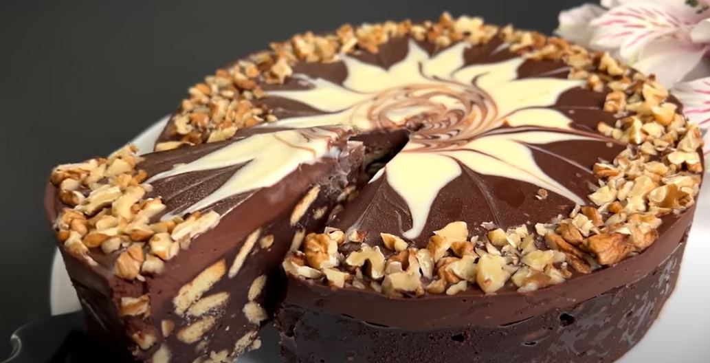 Ρίχνουμε το μείγμα της σοκολάτας πάνω στο γλυκό μας.Στρώνουμε ομοιόμορφα την επιφάνεια.Από πάνω ρίχνουμε την λευκή σοκολάτα στο κέντρο και μ ένα ξυλάκι κάνουμε σχήματα στην επιφάνεια.