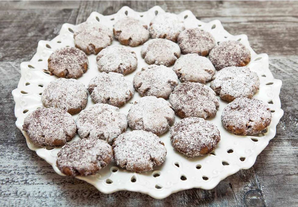 Αφήνουμε τα μπισκότα να κρυώσουν λίγο και τα πασπαλίζουμε με ένα μείγμα ζάχαρης και τριμμένης σοκολάτας.