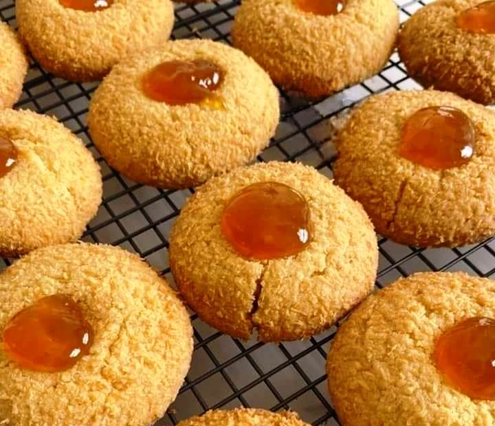 5 Αφήστε να κρυωσουν 5 λεπτά πριν τη μεταφέρετε σε συρμάτινες σχάρες για να κρυώσει εντελώς. Γεμίστε τις εσοχές σε κάθε μπισκότο με μαρμελάδα.