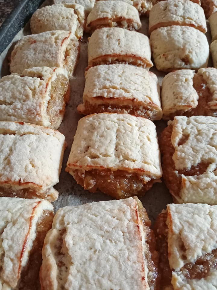 Χώρισα τη ζύμη σε 4 μέρη, άνοιξα σε ορθογώνια και στο κέντρο έβαλα τη γέμιση, τυλίγω τη ζύμη προσπαθώντας να κλείσει καλά, έβαλα το ρολό σε ταψί καλυμμένο με λαδόκολλα προσπαθώντας να βάλω το κλείσιμο από κάτω.