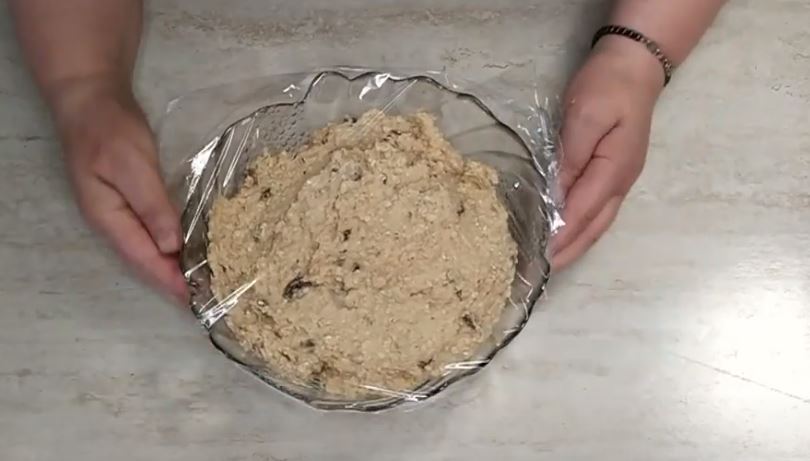 Ανακατεύομε το αλεύρι, την βρώμη , σόδα , αλάτι, κανέλα και σταφίδες.