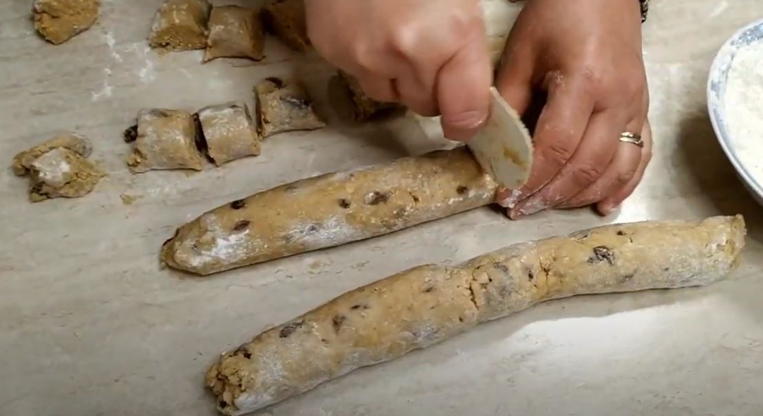 Χωρίζουμε την ζυμη σε 4 μέρη , καθε μερος το πλαθουμε σε ένα χοντρο κορδόνι και μετα κόβουμε μικρά κομμάτια το καθένα κορδόνι.