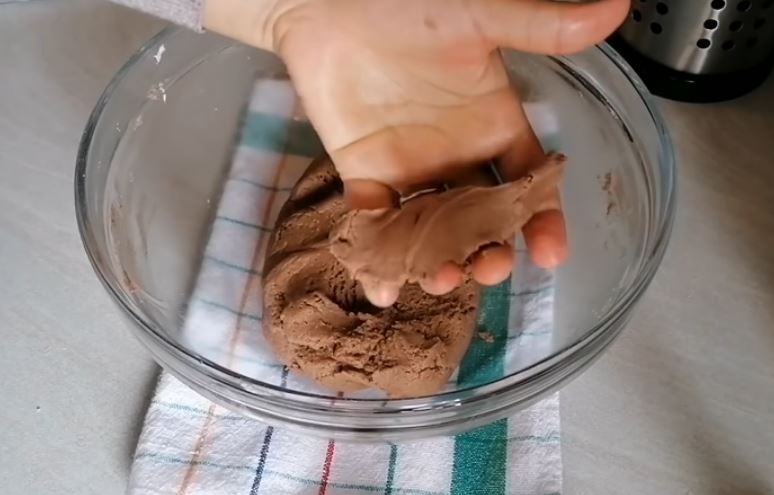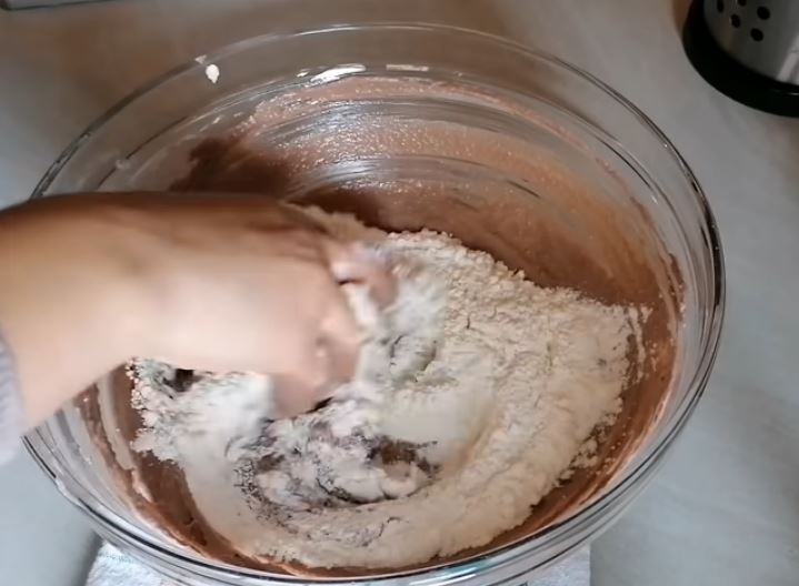 Προσθέτω σιγα σιγα το αλεύρι και ανακατεύω να πάρω μια συνοχή ζύμης μπισκότου και ρίχνω τότε και το μπεικιν.
