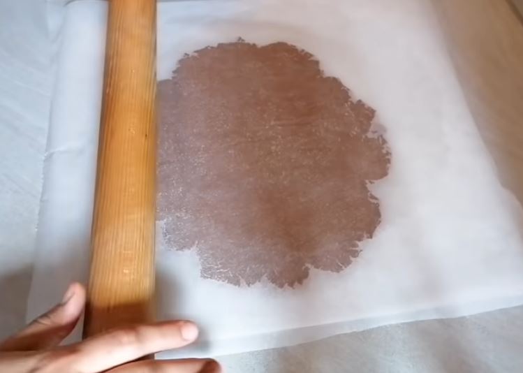 Βάζω την μια μπάλα αναμεσα σε 2 λαδόχαρτα και την ανοίγω σε ένα φύλλο πάχους 1-1.5 εκ.