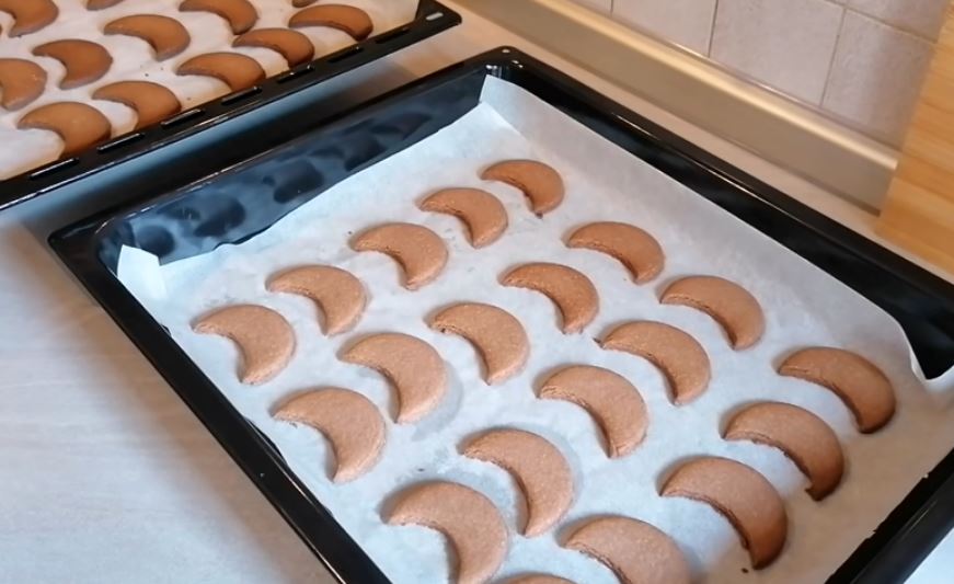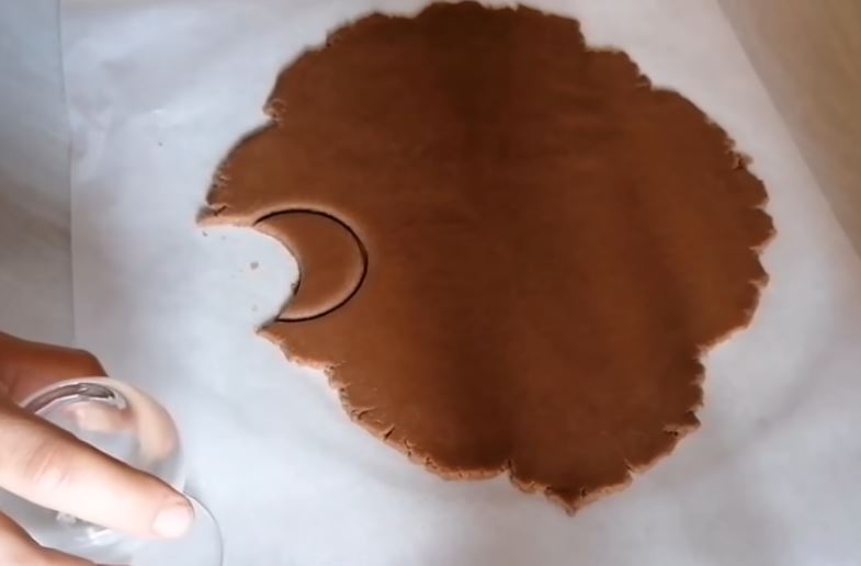Με ένα ποτήρι κόβω μισοφέγγαρα και τα βάζω σε ένα ταψί στρωμένο με χαρτί ψησίματος.