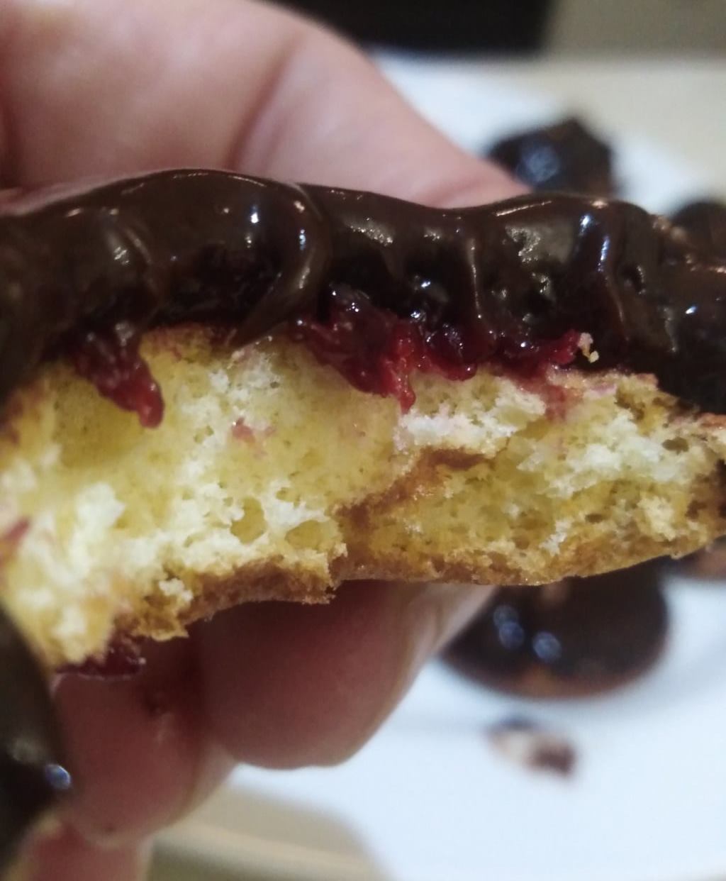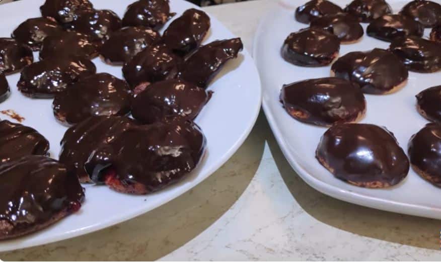 Βάπτιση στη Σοκολάτα: Βάζουμε τα μπισκότα με τη μαρμελάδα στη γκανάς/λιωμένη σοκολάτα και τα καλύπτουμε πλήρως.