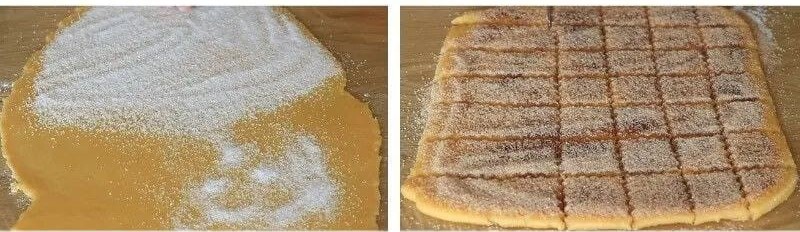 Πασπαλίστε με γέμιση και κόψτε το φύλλο σε μικρά ορθογώνια.