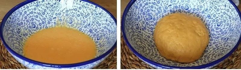 Προσθέστε το μείγμα με το κεφίρ στα ψίχουλα και ζυμώστε γρήγορα μέχρι να σχηματιστεί μια ζύμη.