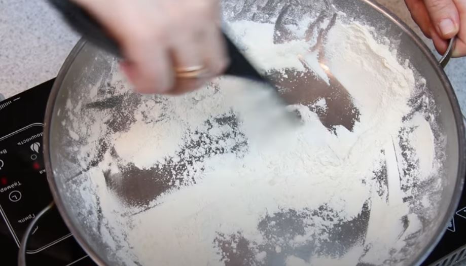 Ανακατέψτε συνεχώς το αλεύρι ώστε να μην καεί. Όταν το αλεύρι μετατραπεί