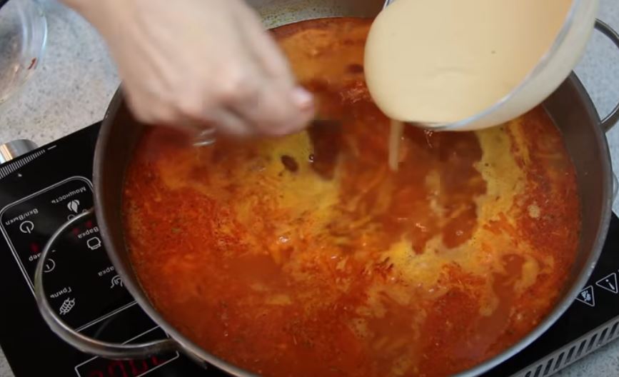 Σοτάρετε τα κρεμμύδια με καρότα για άλλα 3-4 λεπτά. Τέλος, προσθέστε την αραιωμένη