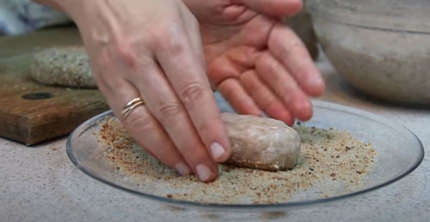 σχηματίστε ένα επίπεδο μπιφτεκι και κυλιστε το σε τριμμένη φρυγανιά ή αλεύρι.