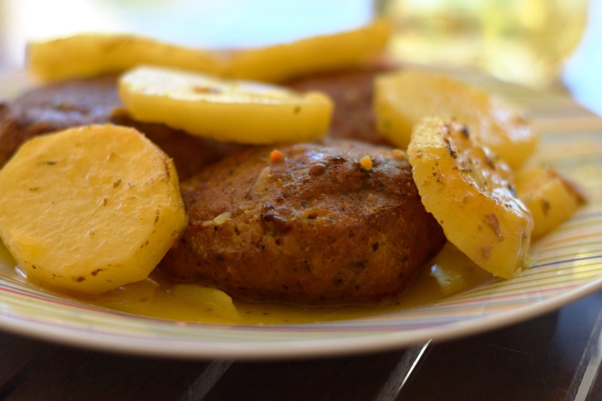 Σε περίπτωση που τα μπιφτέκια έχουν πάρει χρώμα νωρίτερα, τα βγάζουμε από το ταψί και αφήνουμε τις πατάτες μέχρι να ροδοκοκκινίσουν και να μαλακώσουν.