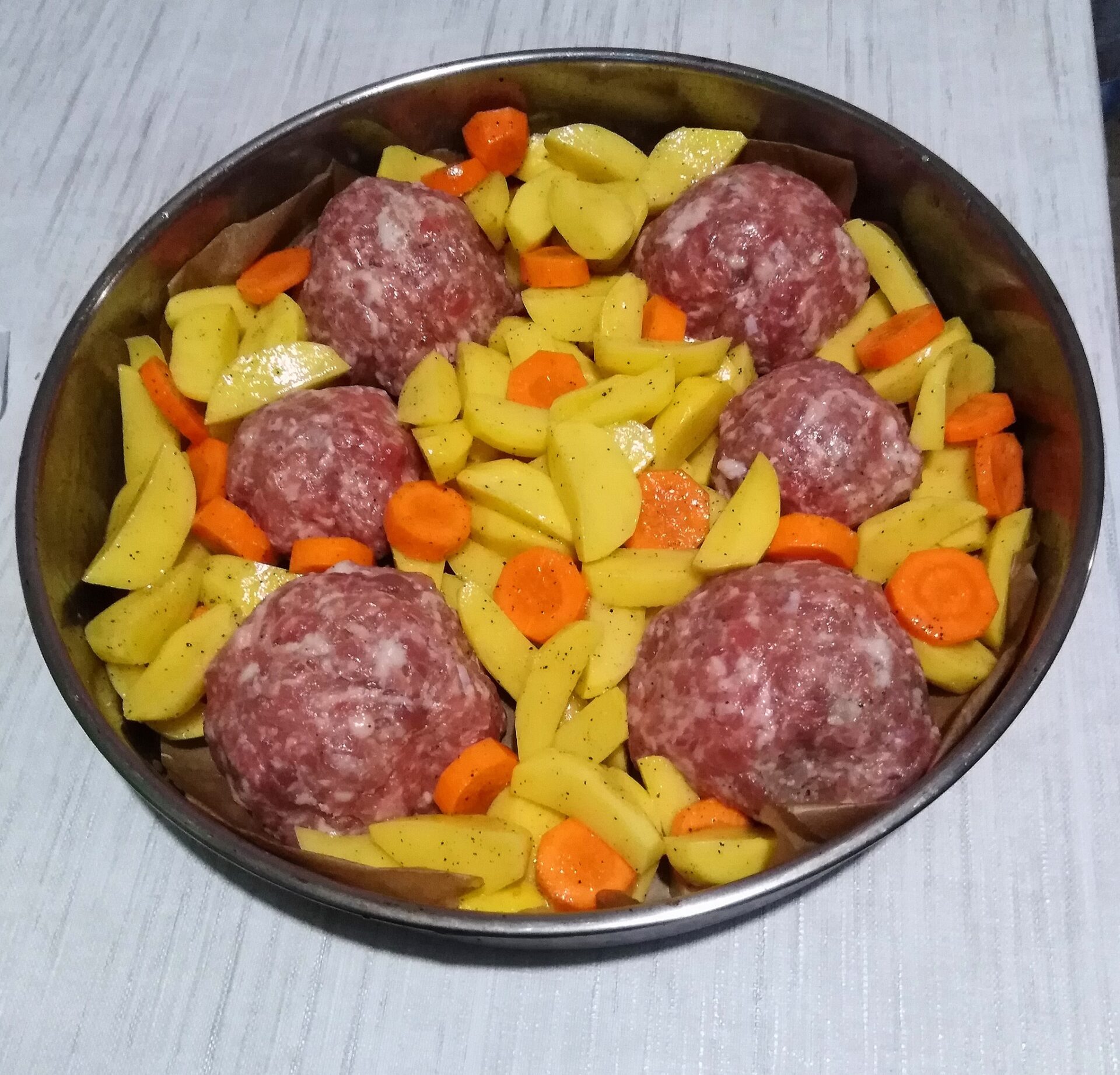 Καθαρίζουμε πλένουμε και κόβουμε τις πατάτες και τα καρότα.