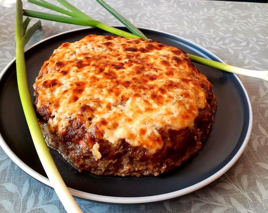 Χώρισα τον κιμά σε δύο ίσα μέρη.Σε λαδωμένο ταψί μοίρασα τον μισό κιμά, από πάνω έτριψα κίτρινο τυρί, έβαλα τουρσί σε φέτες και βραστά αυγά. Στη συνέχεια βάζω από πάνω τον υπόλοιπο κιμά. Ψήνουμε σε προθερμασμένο φούρνο μέχρι να είναι έτοιμο, τέλος πασπαλίζουμε με τριμμένο τυρί και ψήνουμε μέχρι να ροδίσει.