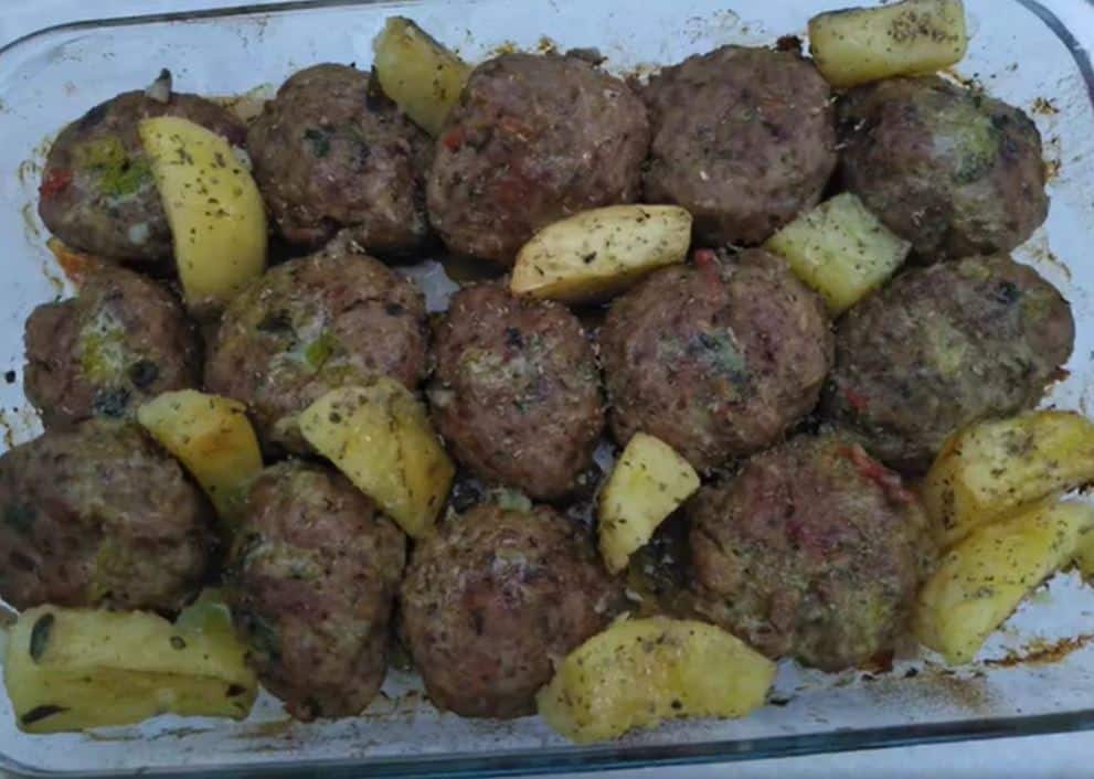 Σε ένα μπολ, αναμειγνειουμε τα υλικά. Το κρεμμύδι το προσθέτουμε αφού το έχουμε γυαλίσει λίγο στο τηγάνι. Πλάθουμε καλά και αφήνουμε να ξεκουραστεί η ζύμη στο ψυγείο για καμιά ώρα. Λαδώνουμε ένα ταψί, πλάθουμε και τοποθετούμε τα μπιφτέκια και προσθέτουμε πατάτες που τις έχουμε περιχυσει και ανακατέψει με μίγμα από αλάτι, λάδι, ρίγανη, λεμόνι πιπερι και μουστάρδα. Λαδώνουμε, αλατοπιπερωνουμε, ριχνουμε ριγανη και ριχνουμε λίγο νερακι στη βάση του ταψιού και ψήνουμε για 1 1/2 ώρα στους 180.