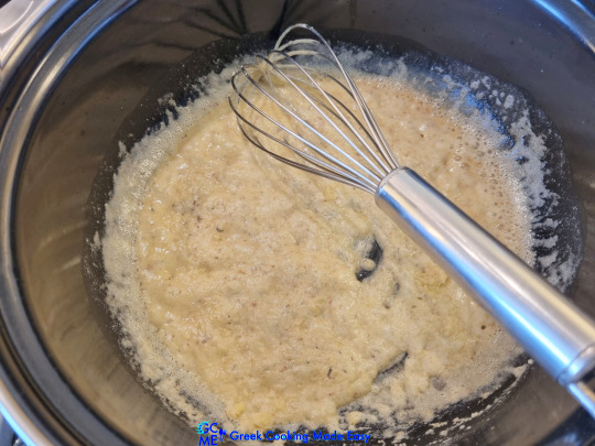 12. Για να είναι έτοιμη, η μπεσαμέλ πρέπει να αρχίσει να πυκνώνει και το σύρμα να κάνει ραβδώσεις (γραμμές) στην επιφάνεια.