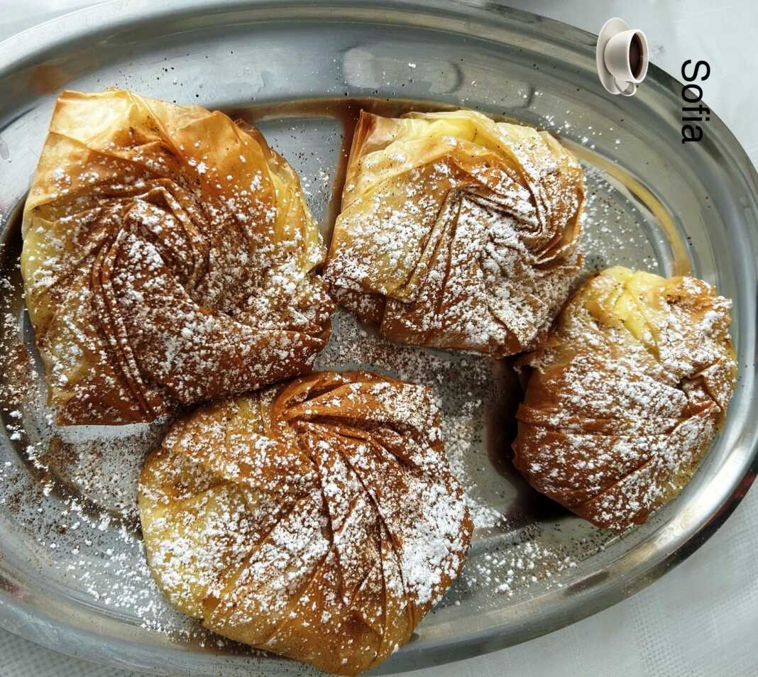 Ρίχνω πιτσιλιστά με το πινέλο βούτυρο. Βάζω ακριβώς στο κέντρο εκεί όπου έχει σχηματιστεί η κορυφή μια γεμάτη κουταλιά σούπας κρέμα. Ξεκινάω από δεξιά και κλείνω με φύλο την κρέμα. Βουτυρώνω καλά. Συνεχίζω με τις υπόλοιπες άκρες και κάθε φορά βάζω βούτυρο στο τέλος, γίνεται πακέτο. Το παίρνω με προσοχή στα χέρια και το βάζω σε ταψί με την σουρωμένη όψη επάνω. Τυλίγω και τα υπόλοιπα και αφού τα βουτυρώσω τα ψήνω στους 180ο μέχρι να πάρουν χρυσό χρώμα στην κάτω σχάρα πάνω και κάτω αντίσταση. Τα αφήνω να κρυώσουν τελείως πριν βάλω άχνη και κανέλα.