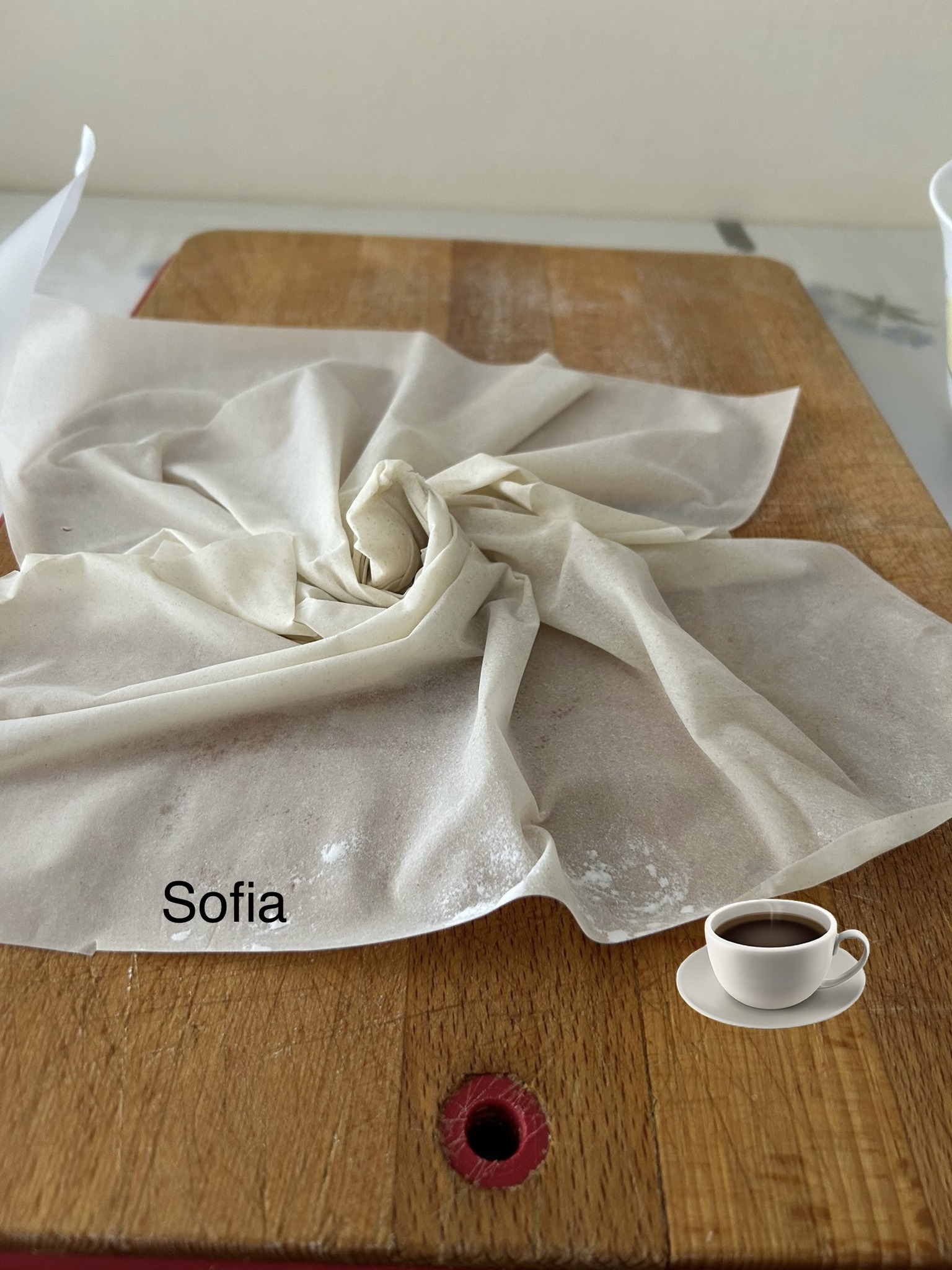 Αφού κρυώσει η κρέμα καλά ξεχωρίζω 6 από τα φύλλα για να κάνω την μπουγάτσα. Παίρνω ένα φύλλο το σηκώνω λίγο στην μέση και κάνω τρείς στροφές προς τα δεξιά.