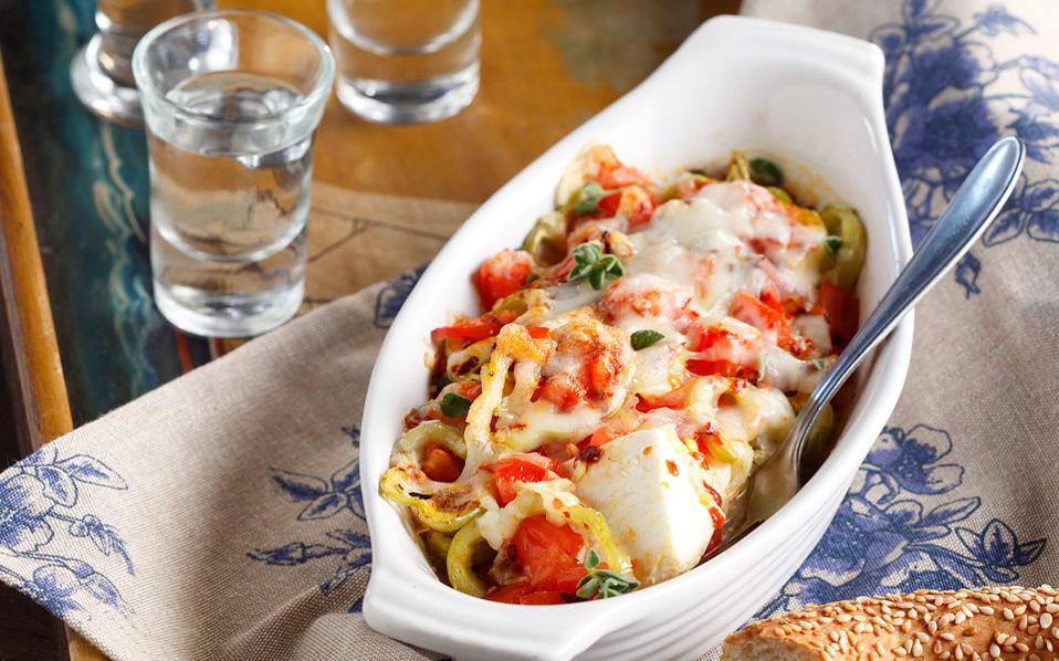 Προθερμαίνουμε το φούρνο στους 200°C. Σε ένα μικρό πυρίμαχο σκεύος βάζουμε τη φέτα, από πάνω την ντομάτα, την πιπεριά και το μπούκοβο.
